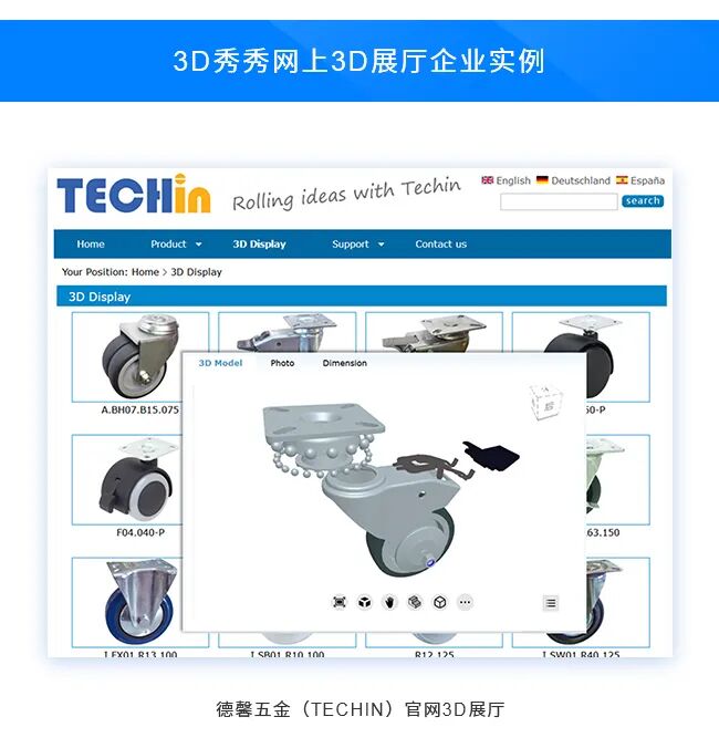 如果您想在线上广交会打造营销亮点,抓住客户眼球,实现产品爆单,产品3D展示您值得拥有!除了汽车、家具、机械、电气、珠宝等产品可以实现3D展示,其他进出口类的产品,如电子家电类、日用消费品类、纺织服装类、医药保健类、电子家电、建材五金等类目均可以通过3D秀秀来搭建网上3D展厅,实现产品的在线3D展示: