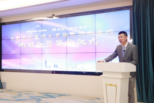 粤海天河城集团董事长黄启宁致辞,他简单介绍粤海天河城集团和石碁项目地块情况,对中创盈科丰富专业的产业园运营经验表示肯定,并表示合作才能发展,共赢才是王道,对此次合力推进项目的建设和运营充满期待和信心!